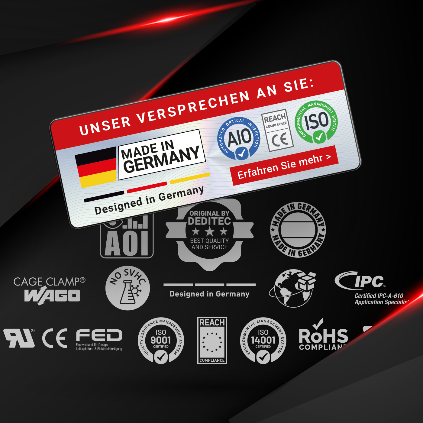 Wenn es um die Produktionsqualität und Produktqualität von DEDITEC geht, steht die sorgfältige Auswahl von Bauteilen im Mittelpunkt. Wir wissen, dass die Grundlage eines jeden erfolgreichen Produkts in der Entwicklungsphase gelegt wird. Daher setzen wir auf Komponenten renommierter Hersteller, die den strengen Anforderungen der Normen SVHC, REACH und RoHS entsprechen. Diese Standards sind nicht nur Vorschriften, sondern spiegeln unseren hohen Anspruch wider, langlebige und zuverlässige Lösungen für Mess-, Steuer- und Regelungstechnik Module „Made in Germany“ anzubieten.