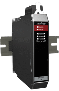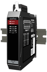 The NET-DEV-DA4/8-16 module is available in versions with 4 or 8 analog outputs. It serves as an expansion option for the NET-CPU base modules and is integrated into an existing NET system using a plug’n play connector (DIN rail bus).