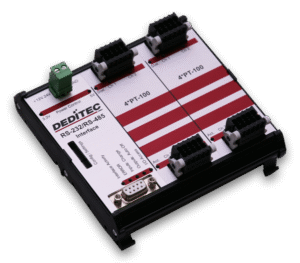 The RO-SER-PT100-4-8 module is available in versions with 4 or 8 PT100 inputs. The serial standards RS-232 or RS-485 are available as interfaces. However, the existing USB 2.0 connection can also be used.